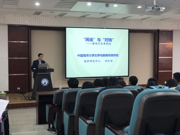 第一讲由中国海洋大学刘怀荣教授担任主讲。刘怀荣教授以“‘闲坐’与‘剪烛’——唐诗艺术美例说”为题,详细介绍了“言有尽而意无穷”这一中国古典诗学审美的核心命题。刘怀荣介绍了诗歌哲学基础的奠定和诗歌向文学理论命题转换过程,结合元稹的《行宫》和李商隐的《夜雨寄北》论证了“闲坐”和“剪烛”的深刻含义。“本诗将惜别之情、长夜寂寞、思乡怀亲等多种情感叠合,巧妙地运用了双线结构、时空重组、对比、反衬以及互文等多种手法,可谓是诗中经典。”他这样说道。他的讲解也吸引了到场师生,精彩之处,掌声一片。