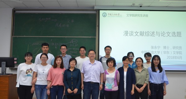 6月1日下午,文学院于南教119顺利举办《漫谈文献综述与论文选题》主题讲座,本次讲座邀请文学院党委书记张永宁主讲,文学院研究生教学管理部副主任徐小雁担任主持人,文学院副院长孙大满、韩淑芹,研究生教学管理部主任淳柳、研究生辅导员梅琳以及2017级硕士研究生参加。