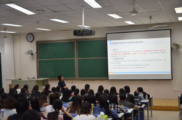 孙老师从文学院2018年优秀大学生暑期夏令营招生简章、中国石油大学硕士研究生奖助体系和文学院硕士研究生专业学科建设情况三方面进行讲解。在介绍夏令营简章时,孙老师从招生计划、申请条件和注意事项等方面为同学们进行详细的讲解,让同学们对夏令营有一个全面的了解。孙老师还为同学们列举了中国石油大学硕士研究生的各类奖助学金,既帮助同学们缓解了经济压力,又激励了同学们专心学习,提高学术科研能力。由于文学院学科和培养计划的调整,孙老师为同学们详细介绍了调整后的各类学科的培养计划,并指出每个学科的特色优势,让同学们对研究生专业学科建设有一个相对全面的了解。在谈到研究生报考时,孙老师提出,考研学科不必与本科专业完全一致,同学们可以根据自己对学科的了解和科研兴趣来选择。最后,孙老师从地域、学科建设和奖助体系等方面为同学们列出了报考文学院研究生的优势条件。