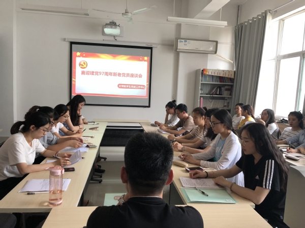 恰逢建党97周年之际,为培养文学院青年大学生党员的爱党、爱国、爱校情怀,坚定政治信仰,继续深入学习贯彻党的十九大精神,文学院学生党建工作中心于6月21日下午在306会议室组织召开以“不忘初心感恩党情”为主题的新老党员座谈会。文学院学生党建工作中心主任韩丙华、各支部书记及新一批预备党员参加了此次座谈会。