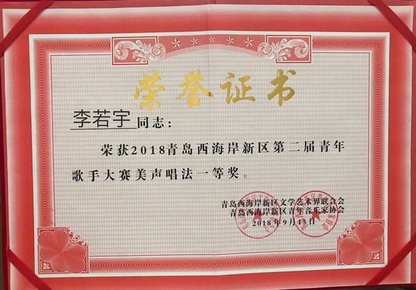 9月15日,“2018青岛西海岸新区第二届青年歌手大赛”在区老年大学举办,由音乐系教师张楠指导的2016级学生李若宇获得美声唱法一等奖。