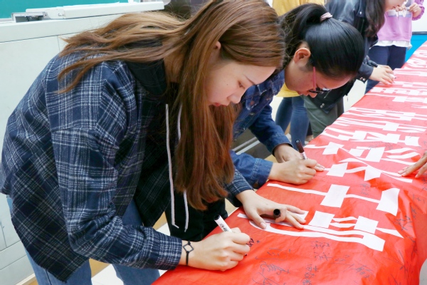 会议最后,全体参会学生干部走上讲台,进行“我志愿做一名‘思想正、作风正、纪律严’的优秀学生干部”条幅签名活动。“最后,我想让各位学生干部扪心自问,是否违背了竞选时的誓言,是否在开展学生工作的过程中迷失自我、忘记初心。希望各位学生干部能努力做到替学生发声、为学生服务,真正做好学生干部的工作。”2017级学生会主席李昱璇说道。