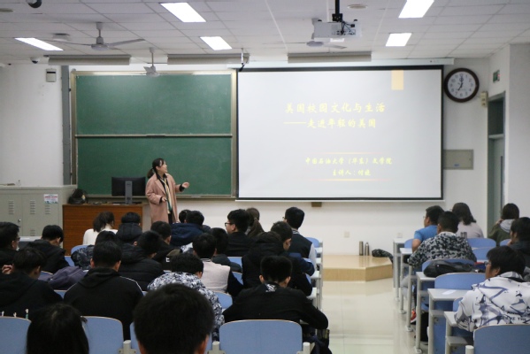 本次讲座中,付晓以她在美国的经历开始,向学生们介绍美国的都市风情,列举了白宫、国会大厦和自由女神像等标志性视觉印象与美国大选的民主文化、好莱坞等精神文化印象,其后,对于美国校园生活,付晓从美国的学校概况、专业分类、课外活动、“奇特”的社团、形形色色的校园工作等方面进行了详细介绍。首先,付晓讲述了美国大学教育的学制概况,并指出美国大学“以学生为中心,注重发挥学生的兴趣特长,重视获取知识的方法和能力”的教育特色。其次,付晓为台下的学生们介绍了到美留学的主要条件,着重介绍了“中美富布莱特项目”及圣欧拉夫学院,为学生走入美国大学提供了有效途径,同时,她还以图片和数据的形式生动地向学生展示了美国大学的精彩生活。其间,付晓强调了在美国大学中普遍存在的“以小班授课为主、软硬件设施完善、教师教学人性化”等特点。紧接着,付晓以“兄弟会”为切入点,带领听众领略不同于中国大学社团活动的美国大学社团活动,同时她说:“希腊社团是西方大学特有的文化,出国留学意味着接触多元化的群体,在这种环境下,可以培养出拥抱多元文化的能力”,不仅希腊社团,骷髅会的严格入会要求和高水平也给学生深刻印象。最后,付晓以“它山之石,可以攻玉”作为结语,开拓了学生的思维,使在场学生对未来充满期待。在讲座过程中,学生们认真聆听,并在提问环节积极交流探讨,现场气氛十分活跃。