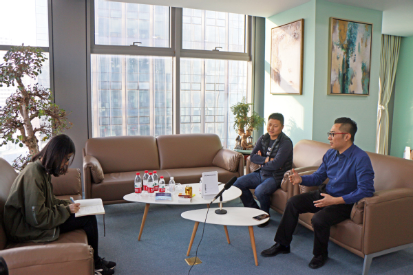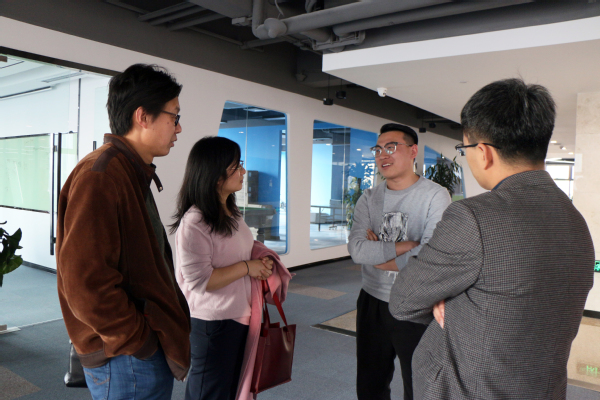座谈伊始,魏学宝、沈壮娟询问视觉志发展近况,并回忆起刘义宝、冯建波、李飞鸿三人上学期间的趣事,现场轻松愉快。当谈到学院人才培养时,魏学宝表示,学院已将关于新媒体的专业实习列入汉语言文学专业培养方案,希望视觉志可以作为主讲嘉宾为在校生做新媒体内容和运营方面的讲座。赵振华立足于学院学生发展需要,邀请他们回校做创新创业指导讲座,为在校大学生在创新创业方面提供借鉴和示范作用。座谈结束后,文学院传媒中心学生代表张淑琪就创业历程、创业心得和感想建议等几方面对刘义宝和冯建波进行了采访。李飞鸿带领我院师生参观视觉志公司以了解公司具体运作情况,在交流中就文学院在视觉志建立“专业实习实践基地”达成初步想法。