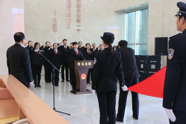上午9点30分整,青岛市黄岛区人民法院组织了入额法官的宣誓仪式。法官们高举拳头,手持宪法,庄严的宣誓:忠于中华人民共和国宪法,维护宪法权威,履行法定职责,忠于祖国,忠于人民,恪尽职守,廉洁奉公,接受人民监督,为建设富强,民主,文明,和谐,美丽的社会主义现代化强国努力奋斗。