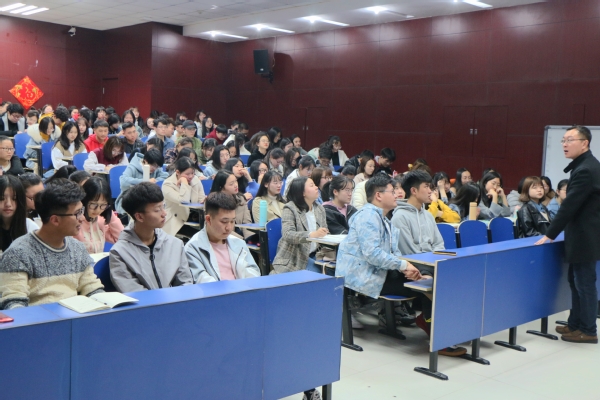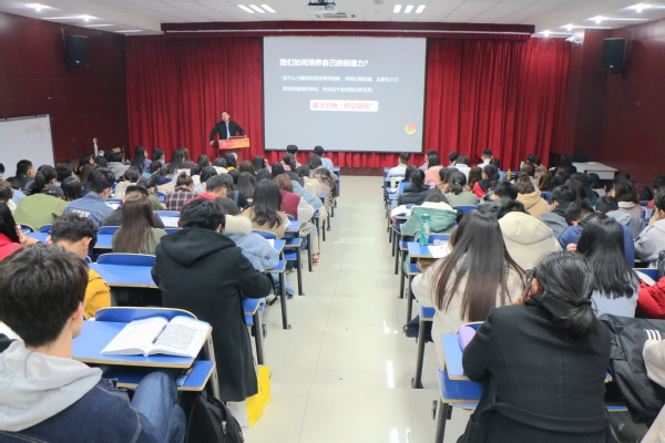 石国卿从创新定义、创造力培养、创新创业赛事简介三方面讲述大学生创新创业。首先,他以“何为创新创业”为话题引出创新创业的定义,并以海尔洗土豆机的发明为例,阐释了创新与创造发明的关系。为激发学生创造力思维,石国卿用线段一笔连九点的游戏跟学生互动,现场学生积极思考、主动回答,气氛热烈。他指出,培养创造性思维需要“敢于创新,树立自信”的态度,并从六大思维、11种创造原理和6种创造技法等方面介绍培养创造力的途径。紧接着,石国卿对“挑战杯”和“中国互联网+大学生创新创业大赛”等创新创业大赛进行了详细介绍,并重点介绍了与文学院专业相关的赛道,鼓励学生关注社会热点问题踊跃参赛,并引用习近平总书记的话激励学生努力奋斗。