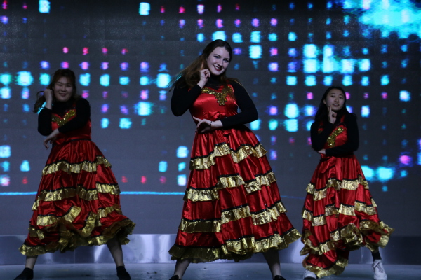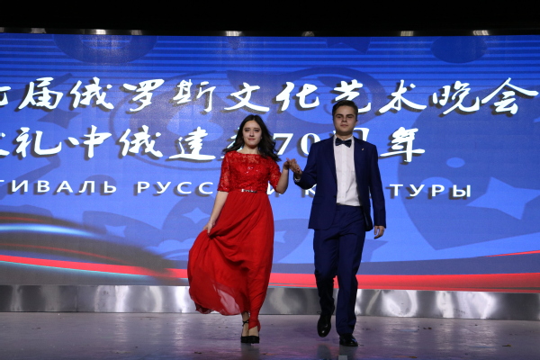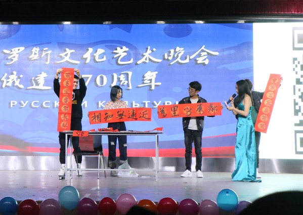 俄语系全体学生与俄罗斯文化爱好者共同参与演出,晚会节目异彩纷呈,舞蹈、歌曲、走秀、乐器演奏精彩交织,向观众们呈现了中俄文化交融的视听盛宴。本次晚会在一曲《爱的华尔兹》中拉开帷幕,穿着艳丽民族服装的中俄学生在舞台上倾情舞蹈,开场便点燃全场激情。孙大满上台致辞,她回顾俄语系发展的光辉历程并祝愿中俄友好关系更上一层楼,现场传出接连不断的掌声与欢呼声。俄罗斯留学生阿米尔带来中文歌曲《你是我的眼》、罗妮卡演唱的《Тримай》、吴诗源与薛太然共同表演说唱歌曲《mockingbird》以及京剧武家坡选段,中俄英三语同台、新颖的表演形式、动人的歌声、精彩的演唱,展示出浓郁的两国文化,传递出中俄学生友好关系。崔圣贤、艾力达等中俄学生共同演唱《朋友》,细腻感人的歌词和挥舞的中俄两国国旗,向全场观众展现了中俄学生的友好之情;校艺术团习舞堂表演的街舞《colorful wlord》以及中俄学生的模特走秀的轮番登台将现场气氛推向高潮。晚会不仅有经典传统民乐的二胡演奏,还有流行歌曲的吉他弹唱,音旋律动,余音绕梁让现场观众有身临其境之感;最后晚会在俄语系学生的大合唱《Позади Крумой Повором》中谢幕。在精彩的节目之余,本次晚会还增加了微信墙、古典文学问答等互动环节,由俄语爱好者协会专门准备的俄罗斯食品让观众在感受视觉冲击的同时尽情品尝舌尖上的美味。