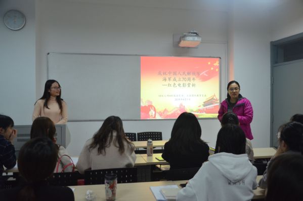 会议伊始,梅琳询问同学们的学习和生活情况,并对目前学习、工作中暴露出的问题与同学们进行交流,她希望同学们能够尽快提高自己的能力,让自己的能力与自己的学历相匹配。同时她也督促各位同学尽早做好职业规划,珍惜时间,努力增强自身实力,使自己在未来的就业中更具竞争力。同时梅琳还提醒同学们遵守学校的各项规章制度,注意自身安全。随后叶薇组织同学们观看电影《建军大业》。2019年恰逢中华人民共和国成立70周年,4月23日将迎来中国人民海军建军70周年节庆,《建军大业》作为献礼建军90周年的历史片,讲述了中国共产党举行武昌起义并创建人民军队的故事。观影期间,不时有同学被先辈们的无私奉献和英勇牺牲而感动落泪。团支书管琪在观影结束后说:“这部影片告诉我们一个道理:坚定信念,向着目标一直前行,生活中要敢于发表自己的见解、敢于创新,或许你有一次是错的,但是吸取经验教训之后,你会获得更大的进步和成功!”