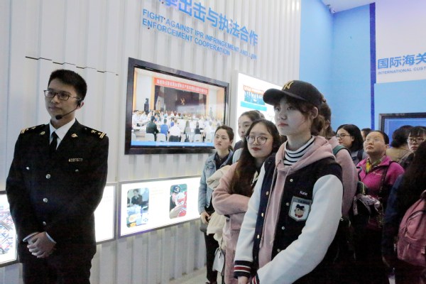 中国知识产权中心(青岛)建成于2016年,与中国海关博物馆、中国海关知识产权(义务)被共同称作中国海关知识产权保护的“一机两翼”。在展示中心工作人员的引导下,师生们先后参观展示中心三个展厅并了解了知识产权保护的国家战略、发展历程及所获得的荣誉,了解了知识产权保护的工作流程和执法情况,参观了侵权实物与样品展,并通过VR、激光3D全息成像等前沿科技进行亲身体验了解涉嫌侵权的产品。通过展区工作人员的讲解,师生们较为全面地了解了我国海关知识产权保护的工作流程、当前海关知识产权保护工作的现状以及近年来我国海关知识产权保护所取得的成就。
