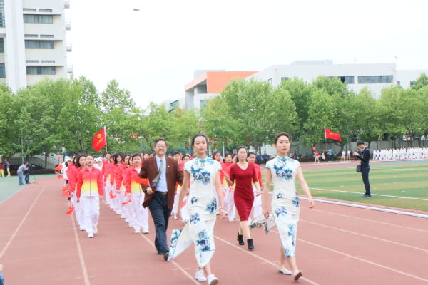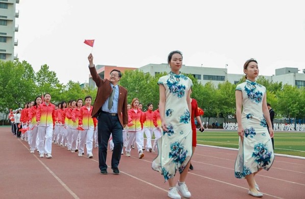 护旗手擎着鲜艳的五星红旗入场,来自青岛、东营两校区的28支代表队穿着整齐的服装,喊着嘹亮的口号,迈着矫健的步伐,依次走过主席台,接受检阅。文学院代表队在党委书记张永宁和学院工会主席冷凌的带领下走过主席台。“文以载道、学以致用、家国同心、追求卓越”,一字一句,铿锵有力,充分体现文学院师生积极向上、斗志昂扬的精神风貌。