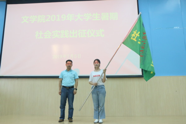 在出征仪式上,陈纪宁介绍了今年文学院组队情况。文学院2019年大学生社会实践共成立48支队伍,涉及理论宣讲普及、红色之旅、文化传承、校友寻访及学校宣传等类别。团委书记赵振华为社会实践团队学生代表陈嘉婷授旗。爱随心行公益助学团队负责人李忠黎讲述了自己的公益之行,让低年级的学生从理论上了解什么是社会实践、社会实践做什么及如何做。大学生记者团副团长梁芳为实践团队做了关于社会实践期间新闻宣传的培训。社会实践负责老师陈纪宁为实践队伍做安全知识培训,强调在社会实践期间的交通安全、人身财产安全、交友安全、野外安全与突发意外、社会实践中的权益维护等全方面的安全指导。