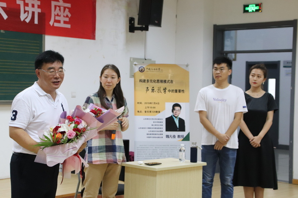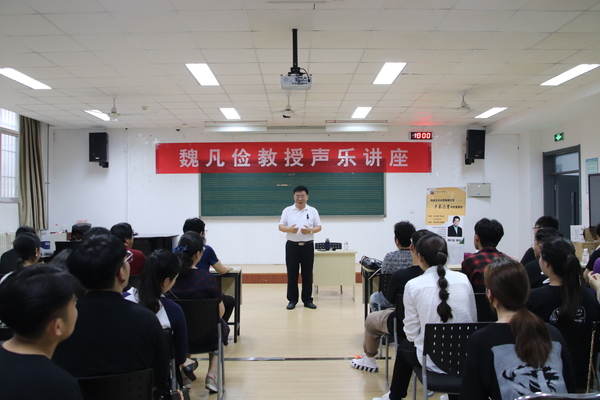 7月4日,“音乐大讲堂”活动讲座——“构建多元化思维模式在声乐教学中的重要性”在音乐系129教室举行。本次讲座由中国声乐家协会副主席、山东省音乐协会理事、山东师范大学音乐学院魏凡俭教授主讲,青岛声乐协会会长、青岛大学声乐教授韩乃舜老师,中国海洋大学教授孙道东、郑琳、隋天开老师,山东科技大学艺术学院副院长刘寿臣教授、匡传英老师和管成峰老师以及我校文学院音乐系师生参加。