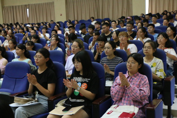 邹维忠首先介绍参会学院领导以及教师代表,并热烈欢迎各位新同学加入文学院大家庭。教师代表赵婷廷通过分享自己的大学生活经历,表达了对2019级新生的期待,鼓励新生在大学生活中树立远大目标,加强自我管理,努力争取自我发展。作为“大学长”代表,2017级英语专业的苏施雨介绍了“大学长”在学习生活等方方面面的作用,并表达了对新生们的热切关心与殷切希望。随后,2018级法学硕士研究生宋华强调在大学生活中应学会自主规划,自主发展,强化自身优势,才能在走出校门时具有竞争实力。“努力、努力、再努力是新时代的最强音;学习、学习、再学习是新时代的进军号!”她激励新生时说道。2019级新生代表汉语言专业王梓橦上台发言,她认为进入大学应先明确远大志向,不负韶华,而后还需要用刻苦与勤奋来落实。慷慨激昂的演讲表达了她对于大学生活的雄心壮志以及对在座新生的勉励。
