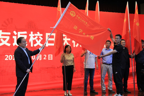 10月2日,学校在逸夫礼堂隆重举行校友返校日庆祝大会,王思刚作为优秀校友代表发言,他说:“一刻石大人,一生石大人。石大经历、石大精神是教育我们、陶冶我们的‘源头活水’!希望我们每一个石大人都不忘来时路,心怀感恩,携手并进,为石大‘加油’!”随后王帅代表法学2005级从副校长姚军手中接过聚会班级班旗。在捐赠仪式上,2005级法学专业学生与其他校友一起认捐图书,并与参加校友返校日庆祝大会的校友老师们,合照全家福,齐声祝愿母校“桃李芬芳,再创辉煌”!
