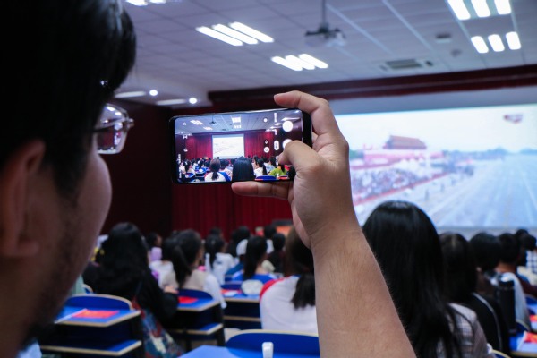 2019级新生也组织观看了阅兵,刚入学经历完军训的他们更能够和这场阅兵产生共鸣。“军训那时的苦累在今天看来好像已经不能称之为苦累了,这些方队中的人哪一个不是经历过比我们军训还苦百十倍的训练,我对他们肃然起敬。而且走在石大的校园中,基础设施便利智能,教学体系严谨求实,校园商品便宜实用,食堂饭菜美味可口。我更是没有理由喊苦喊累,更应该务实努力。每每回顾石大以前的风雨飘摇,从荟萃湖畔的盐碱地到唐岛湾畔的新校园。我,作为一名学生,更加切实体会到了中国正在一天天强大。”法学新生曲直感慨道。