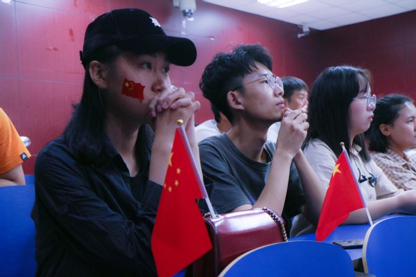 学院党委副书记邹维忠脸贴红旗图案,手持小红旗与学生们一起观看阅兵。在看到许多学生自发穿着红色衣服且拿着国旗时,邹维忠对此表示欣慰,细微的行为展示出文学院学生所具有的爱国意识。他希望学生们能通过大学的学习和生活培养自己正确的世界观、人生观和价值观,以所学回馈社会和国家,将爱国情怀融入到实践过程中去。