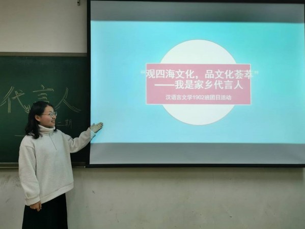 为增进支部团员之间的了解,展示支部团员的家乡文化风采, 文学院汉语言文学1902团支部在11月18日和11月25日,分别于南堂楼317教室和113教室,分两期举办了 “观四海文化,品中华荟萃”——“我是家乡代言人”的主题活动,活动开展顺利。本次活动由汉语言文学1902团支部书记高波主持,汉语言文学1902团支部全体成员参加。