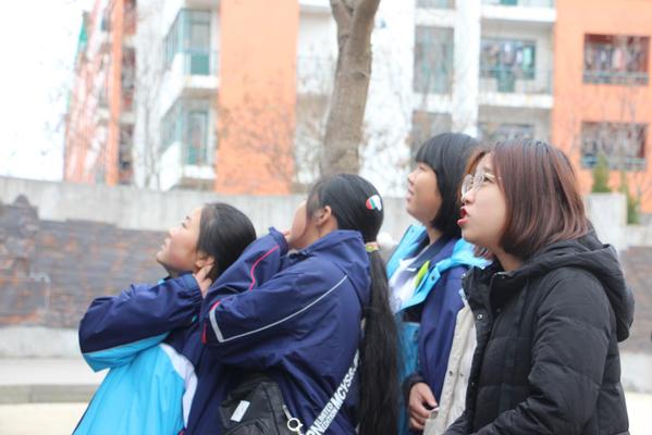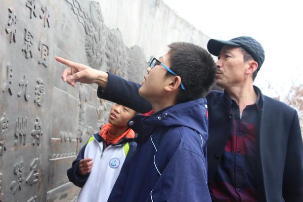 学生和老师共同欣赏学校浮雕 李文慧摄