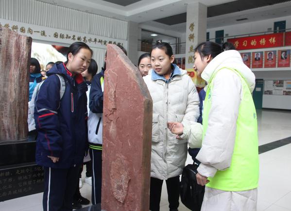 志愿者为学生们讲解化石文化 李文慧摄