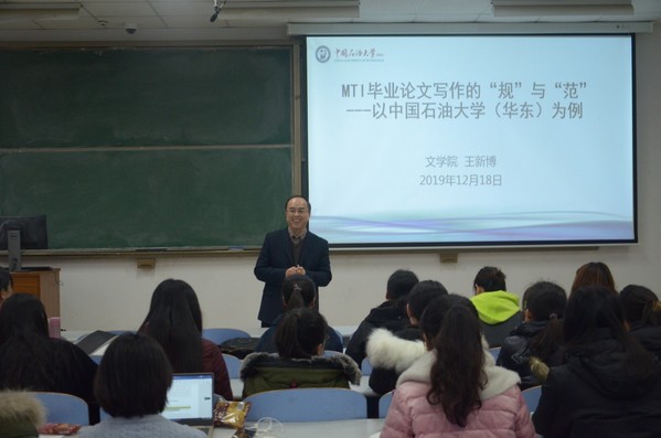 12月18日下午,太阳成tyc122cc集团文学院副院长,硕士生导师王新博教授在南教117室作了一场题为“MTI毕业论文写作的‘规’与‘范’——以太阳成tyc122cc集团为例”专题讲座,本次讲座由研究生教学管理部副主任徐小雁老师主持,研究生教学管理部主任淳柳老师及我院翻译硕士到场聆听了讲座。