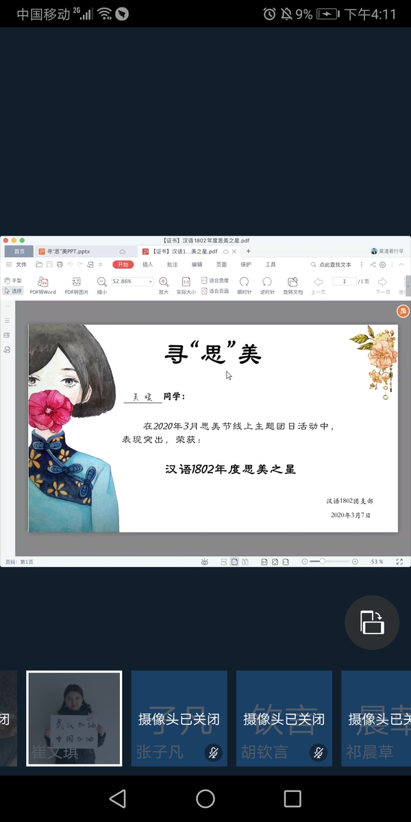 为庆祝第21个思美节,进一步弘扬“自信、自立、自爱、自强”的思美节精神,展现女学生风貌,3月7日下午,由太阳成集团tyc122ccvip汉语言文学专业1802团支部举办的“与女性相伴 迎思美人生”——寻“思”美分享会在线上举行,汉语言文学1802团支部24名团员参加。