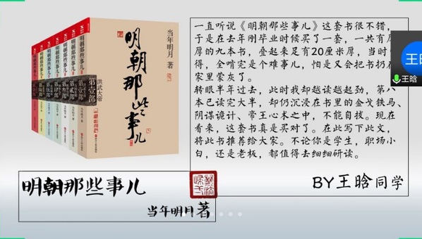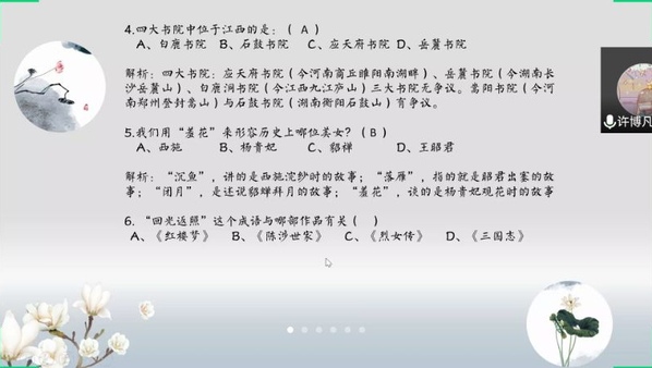 会议伊始,许博凡向同学们介绍了传统文化的基本概况,包括其名词解释、特点及意义等,让支部成员对传统文化有初步了解。随后,许博凡播放了名家诵读的经典作品,包括杜甫的《饮中八仙歌》,李白的《清平调三首》《将进酒》。第三部分为文化常识竞答环节,同学们对PPT上呈现的传统文化常识问题进行了热烈而积极的回答与讨论。活动最后一部分为阅读篇目分享,其中葛茹梦等同学用朗诵的形式分享了自己喜爱的诗歌,岳阳等同学向大家推荐了自己心仪的书本。