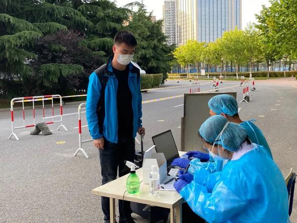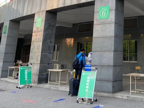 学院领导、辅导员以及相关负责人提前到达学校门口,做好一切准备以迎接首批返校生。除学校门口外,我院相关负责人也前往机场、火车站接站点,组织和护送学生们安全返校。进入校园时,学生们佩戴口罩、间隔两米有序排队,待工作人员对行李进行消毒后,凭一卡通或身份证刷通道机进入校门,接受体温检测,领取蓝标。随后根据现场人员指引,有序进行核酸检测,领取绿标、健康包,返回宿舍。学生积极配合消毒、核酸检测等一系列返校手续,整个过程便捷高效,秩序井然,显示了我院学生的良好风貌。