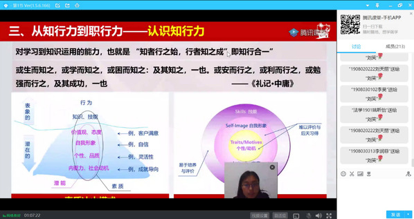 刘笑则从知行力与职行力两个方面讲解青年学生应该如何做。知行力分为硬能力和软能力。在大学的学习中,优化自己的思想,提升自己的格局,不局限于书本知识,形成自己的思想和灵魂,这是提升知行力的意义所在;洞悉职行力,需要增强理解与交流能力、科学视为能力、管理能力、应用分析能力和动手能力。刘笑说,只有在大学校园不断积蓄能力提高自己的知行力,提升自己对知识运用的能力,知行合一的能力,提高自己进行职业选择的职行力,才能真正的适应时代需求,贡献青春力量。”最后,刘笑指出,青年大学生要励志,立鸿鹄志,做奋斗者;要求真,求真学问,练真本领;要力行,知行合一,做实干家。