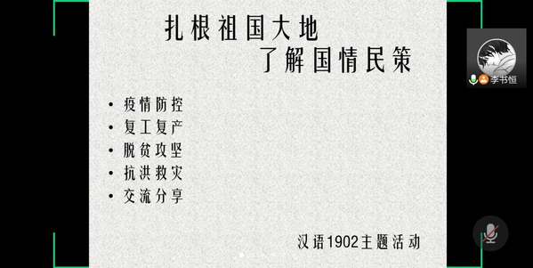 为深入扎根祖国,了解国情民策,7月22日晚,汉语言文学1902团支部开展“扎根祖国大地,了解国情民策”主题教育活动。本次活动内容分为疫情防控、复工复产、脱贫攻坚、抗洪救灾、交流分享五个部分。本次活动由支部委员李书恒主持,汉语言文学1902全体支部成员参与。