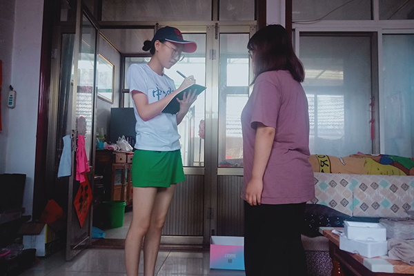 队员与山东青岛当地村民交谈并记录建筑变化 吴媛 摄