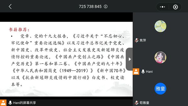 8月17日,为进一步推进研究生学习党史、新中国史、改革开放史、社会主义发展史知识,培养党员、团员读书习惯,持续深化爱国主义教育,增强党员初心使命意识,传承红色基因,法学系研究生党支部与硕士生法学专业2018级一班团支部一同举办博韵书香第三十六期学“四史”、读好书、守初心活动。