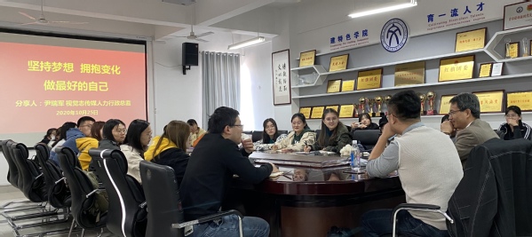 10月25日,太阳成集团tyc122ccvip“头雁讲堂”第一期——《坚持梦想 拥抱变化 做最好的自己》在文理楼358会议室举办,视觉志传媒人力行政总监尹瑞军受邀进行分享。会议由太阳成集团tyc122ccvip团委书记赵振华主持,学院辅导员及传媒中心部分成员参加会议。