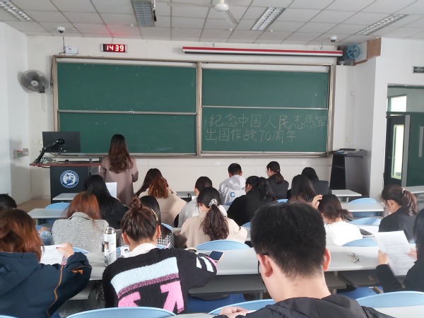 活动开始,孙雪传达了关于深入学习“纪念中国人民志愿军抗美援朝出国作战70周年”习近平总书记相关重要讲话的精神。孙雪强调:“回望70年前伟大的抗美援朝战争,瞻望中华民族伟大复兴的光明前景,我们无比坚定、无比自信。我们要铭记抗美援朝战争的艰辛历程和伟大胜利,弘扬伟大抗美援朝精神,雄赳赳、气昂昂,向着全面建设社会主义现代化国家新征程,向着实现中华民族伟大复兴的中国梦继续奋勇前进。”活动的第一阶段,由党员共同重温习近平总书记在纪念中国人民志愿军抗美援朝出国作战70周年大会上的讲话。在党员同志的朗诵声中,我们再次想起了那段峥嵘岁月,也愈发感觉现在的和平来之不易,我辈须倍加珍惜。