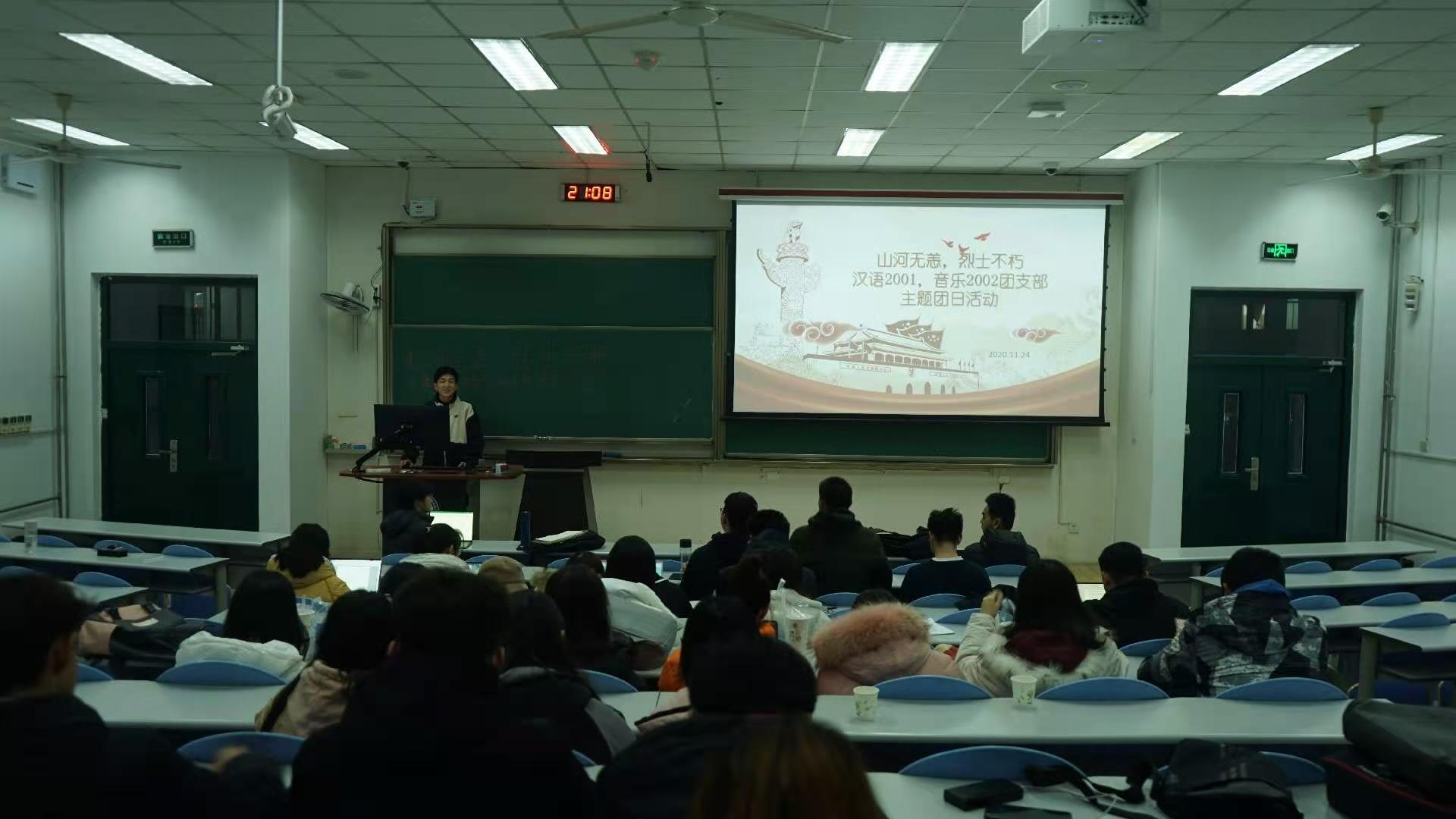 为响应习近平总书记在纪念中国人民志愿军抗美援朝出国作战70周年大会上的讲话精神,2020年11月24日,汉语2001团支部,音乐学(管弦)2002团支部在西环204室联合举办“山河无恙,烈士不朽”主题团日活动。该次活动由汉语2001团支部成员周子豪主持,各团支部成员全部参与。该次活动旨在弘扬伟大的抗美援朝精神,加强爱国主义教育,增强学生的家国情怀,鼓励学生为决胜全面建成小康社会,实现中华民族伟大复兴的中国梦而不懈努力。
