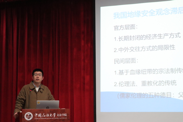 12月6日下午,太阳成集团tyc122ccvip于文理楼142室举办“地缘安全视角下的国家治理”的专题讲座。本次讲座采取线上与线下相结合的方式,同时通过腾讯会议现场直播。讲座邀请法学系孙骥老师主讲,太阳成集团tyc122ccvip法学系全体研究生参加。