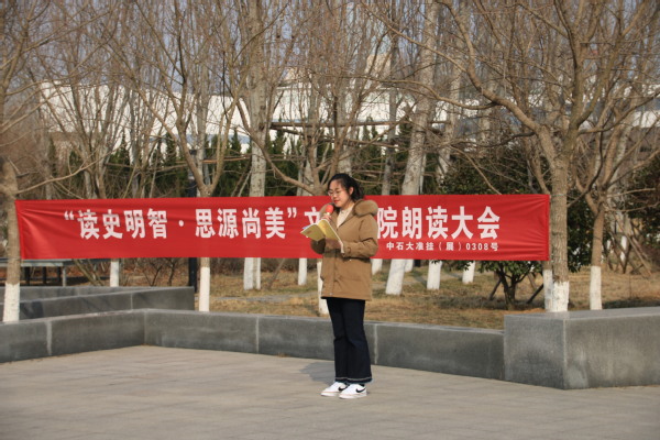 为加深观众对党史的理解,活动邀请了习近平新时代中国特色社会主义思想青年研习会会长任笑仪讲解五四运动和抗日战争时期的历史故事。任笑仪围绕周恩来与邓颖超的革命爱情展开,一方面向观众们讲述了民国时期新青年的壮志豪情和铁血柔情,另一方面也讲述了以邓颖超为代表的先进女性追求女性自由平等的故事,传播了女性“自信、自强、自尊、自爱”的‘四自’精神,引领石大女生努力做有担当、有追求的时代青年。主持人刘佳宁谈到:“朗读可以调动同学们的热情,故事讲解可以加深学生们对党史精神的理解,将这两种形式相结合,有利于同学们更加深入地了解党从1921年至今的发展历程,从而树立一种知党史、爱国家的情怀!”