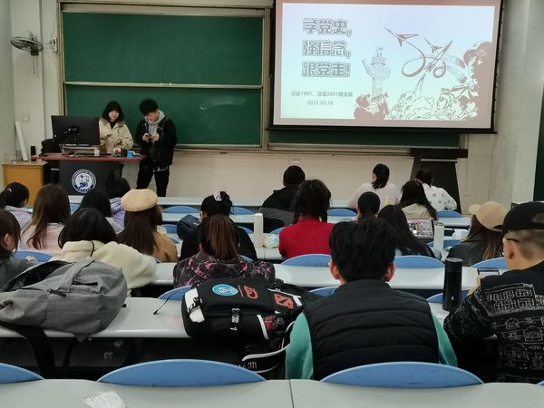 为加深党史的学习,坚定学生的理想信念,3月16日,汉语1801团支部、汉语2001团支部在西环107开展“学党史、强信念、跟党走”学习交流活动。活动由汉语1801团支部书记蒋雯宇主持,汉语1801团支部、汉语2001团支部全体成员参加。