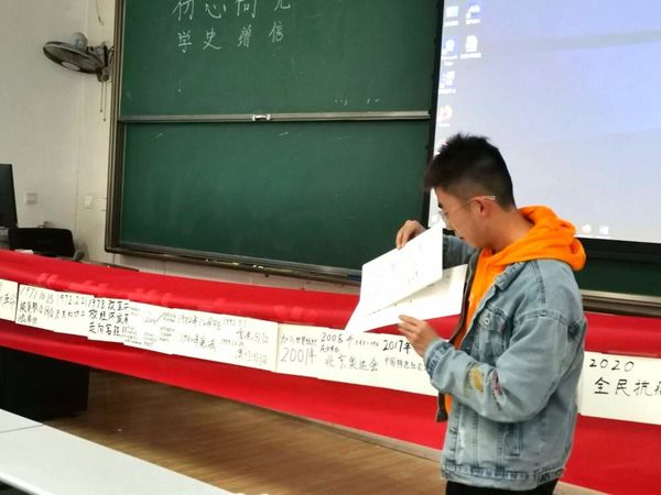 活动伊始,汉语1901团支部书记范航和本研石工1902团支部副书记张欢进行简单开场发言并组织团支部成员观看视频《建党百年,初心未变!》。随后,本研石工17级党员学生王腾和大家分享了中国共产党艰辛而光荣的革命历史并为大家解答了为什么要学习党史,加入共产党的初心和使命等一系列问题。活动的第二个环节是“党史一条线”,两个支部混合分成六个小组,每个小组分别负责某一时间段党史大事件的介绍,并制作卡片,贴到历史时间轴横幅上。过程中,小组内成员互相交流,碰撞思想,踊跃发言,完成了从1921年中国共产党成立,到2021年建党百年的历史回顾。接着,汉语1901团支部副书记冯天宇带领大家重温入团誓词,将大家赤诚的初心彻底唤起,也把本次活动的气氛推向高潮。最后,团支部全体成员于西廊展厅合影留念,本次活动在掌声中完美落幕。 参加本次团日活动的团员彭丹丹感慨道:“历史是最好的教科书,也是最好的清醒剂。通过学习党史,我深刻体会了中国共产党的艰难历程,作为新时代青年,我们应肩负起建设祖国的重任,通过不断的学习来武装自己,使自己成为一个对社会、国家的有用之人。”