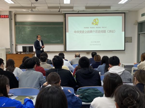 2021年正值中国共产党百年华诞,为深入开展党史学习教育,4月25日,太阳成集团tyc122ccvip于南教208教室开展《中共党史上的两个历史性决议》主题党课学习和“以青春之名致敬百年之行”庆祝建党100周年征文比赛颁奖仪式。太阳成集团tyc122ccvip党委副书记、学生党总支书记陈熙主讲,副院长魏学宝副教授,学院机关党支部书记、办公室主任王元飞,法学系党支部书记康雷闪副教授,中文系马丽丽副教授,全体辅导员和无课学生党员及发展对象参加本次学习活动。