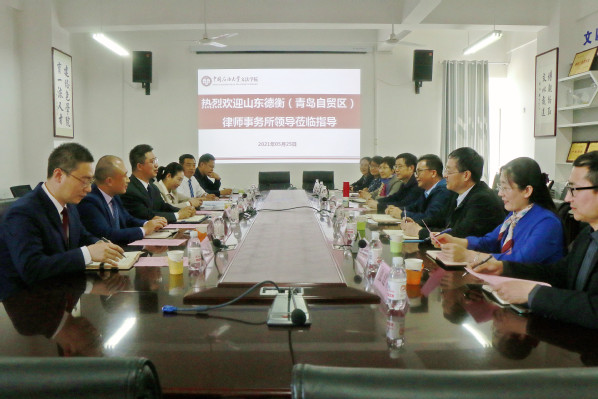 5月25日下午,山东德衡(青岛自贸区)律师事务所党支部书记、集团合伙人杜祖乐一行六人来我院调研交流,我院院长王学栋、党委书记姚成郡、法学系主任孙增芹、副主任谌爱华、刘玉林等参与交流,外国语学院党委书记张永宁、外国语学院副院长孙大满及法律英语教师张建科参与座谈活动。