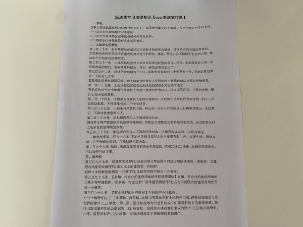 实践队队员走访了多家院落以及村民常聚集的街口,采取面对面普法的形式,向村民讲述其整理的与农村生活息息相关的法律法规以及相关应用,现场解答群众的咨询如老人随孩子搬到城里但又放心不下一辈子守着的土地其后续的土地承包问题中该发包给谁又如何发包;又者,两家人订婚男方向女方给付彩礼后男女二人又分手,彩礼到底该不该退还,退还的话要退还多少。