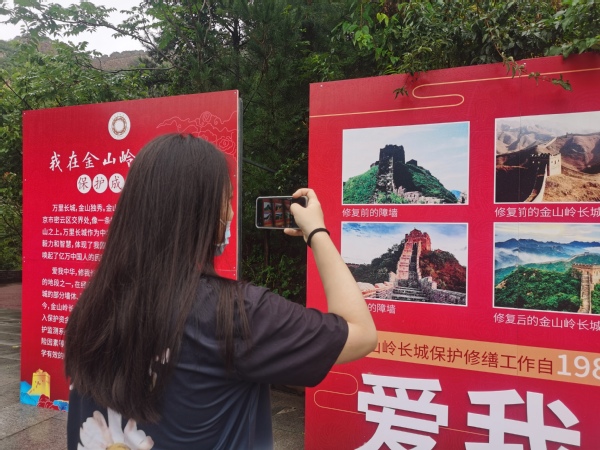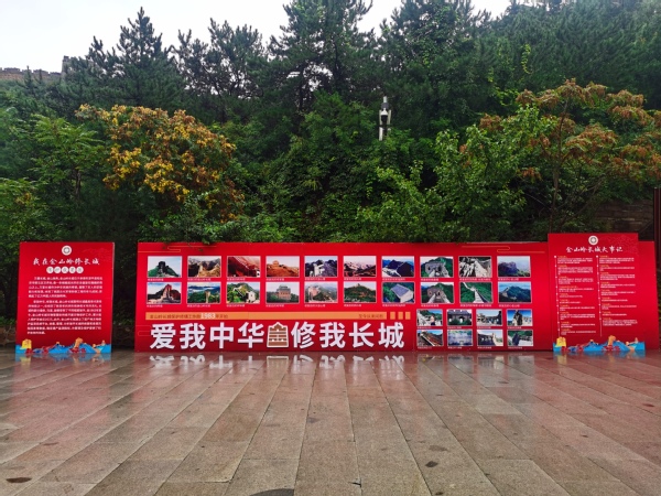 通过观察长城周边“我在金山岭修长城”保护成果展和工作人员的介绍,实践队员们了解到,这次修缮是金山岭长城第三次大规模保护修缮,原材料,原工艺,沿用古法修缮,坚持最小干预,因为金山岭长城经历了400多年岁月的洗礼,这些保留下来的斑驳城墙正是我们了解过去文化和历史最好的载体。保护修缮过程中,工作人员遵守不改变文物原状和最小干预的原则,坚持“原形制、原工艺、原材料”原则,采用成熟、合理,可逆的技术措施,严格控制各类干预措施的实施范围和工程量,妥善保护长城遗存的真实性、完整性和沧桑古朴的历史风貌与建筑特色,使长城的历史价值、文化价值、社会价值等得以延续和传承。一代又一代“守城人”展现了文物工作者守护文化遗产、在新时代传承红色基因的精神和斗志。一张张修复前后的对比照片、一件件金山岭长城大事记使队员们为之震撼和感慨。