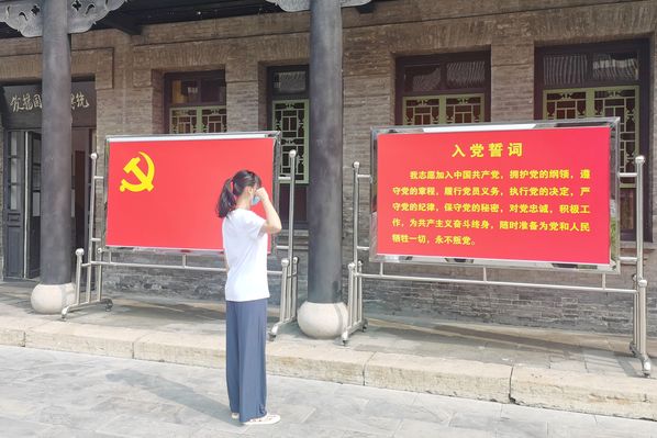 图为“忆佰”实践队山西小分队赴山西国民师范旧址革命活动纪念馆参观,并宣读入党誓词 王奕晖摄