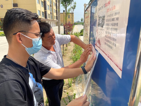 实践队员常洪凯与社区老党员一同张贴海报 冯政嘉摄