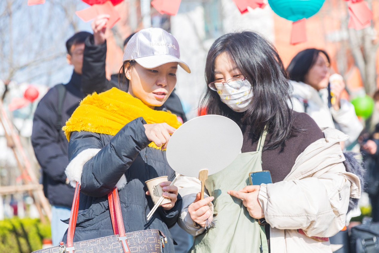 在“墨香飘远,福运绵长”展区,师生们共同写下“福”字,表达对未来的美好期许;“团圆添岁,冬饺暖心”摊位前热气升腾,刚出锅的饺子与汤圆为师生带来了冬至的特色食品。“良辰梅景”活动区与“画脸谱”区也热闹非凡,同学们在准备好的空白团扇上吹墨成梅、在空白脸谱上勾画生旦净末丑,五彩斑斓的“高定”产品展现着同学们的创造力。爱美的女生亲身体验花钿妆容,点缀冬至之韵;爱游戏的男生钟情于投壶,大展高超技艺。活动现场还设有交友箱,或许自己的一生知己就在此刻相遇。“这些活动非常有趣并且很有意义,在参与游戏的过程中我感觉到了温暖的冬至氛围,并且在各种文化体验中更深入体会到了我们传统文化的魅力。”汉语言文学专业2002班的何甜甜拿着自己的“高定”团扇说。
