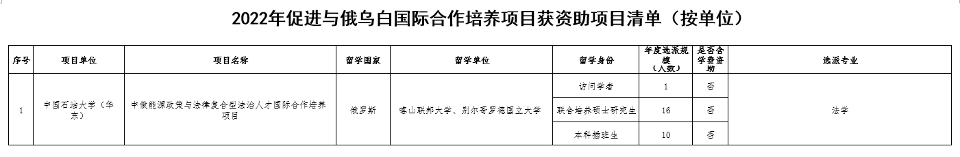 近日,国家留学基金委公布2022年促进与俄乌白国际合作培养项目评审结果。我院法学系申报的 “中俄能源政策与法律复合型法治人才国际合作项目”获批。该项目是国家留学基金委2020年开始设立的国外合作项目,旨在深化我国与俄罗斯、乌克兰、白俄罗斯在各领域的合作,促进国内高校与俄乌白高校、科研机构开展国际化人才培养。“中俄能源政策与法律复合型法治人才国际合作项目”是我院获批的首项促进与俄乌白国际合作培养项目。