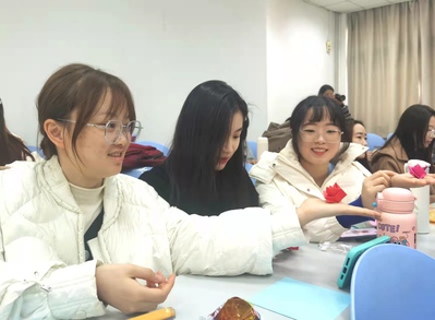 “请大家将叠好的玫瑰花赠予身边的女生。”在众人结束手工制作后,宋雪贤提议道,将活动推向了高潮。团支部中的男生成员纷纷向女生送出自己叠的玫瑰花表达“思美节”祝福,女生彼此间也相互赠送,表达对对方的情谊。“感觉很久都没有沉浸的、耐心地去做一次手工了,很喜欢这样的思美节活动,为简单的折纸赋予了爱的意义,也让我在参与的过程中,进一步意识到要尊重女性,爱护女性。”法学2002团支书杨国威感慨说。