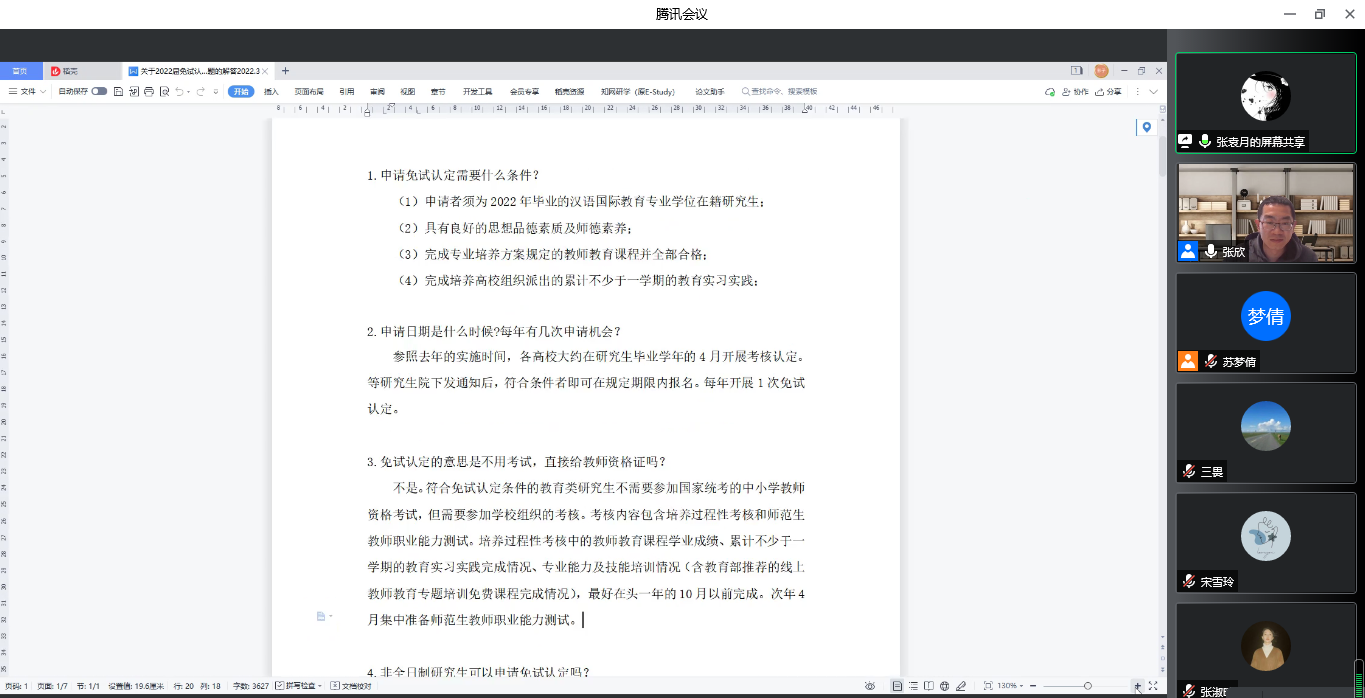之后,围绕学生学业、生活中的困惑展开会议座谈,重点讨论了学生的论文、实习、就业三方面遇到的困难,与会教师针对以上问题给予了解答与帮助。魏学宝同志针对论文困难提出了几点建议与要求,一是加强阅读,增进自身理论技能素养,提高自身本领素质;二是坚守科研诚信,坚决杜绝论文抄袭;三是党员同志发挥模范带头作用,自身做好学术规范,以身作则影响其他同学。实习导师代表丁鹏同志就学生提出的实习困难作了回答,他指出,汉硕研究生的实习主要是在第二学年,学生可以自行联系实习,也可以在校内参与教学实践。关于校外实习,丁鹏同志推荐与学校有合作的科大讯飞、或一些针对外国人的线上汉语教学机构;关于校内实习,则强调学生一定要主动联系实习导师,积极进行教学实践。党外人士沈壮娟老师针对就业问题给同学们介绍了汉硕毕业生的就业去向,同时指出,毕业年级要积极主动寻找就业机会,多投递简历,增加就业几率,低年级学生需要尽早树立就业目标与就业方向,在实习实践中锻炼自己,以增强竞争优势。会议最后,张袁月同志就学生关心的汉硕毕业生高中语文教师资格证免试认定问题做了解答。其他与会教师也建言献策,对学生们的问题进行细致的探讨和解答。