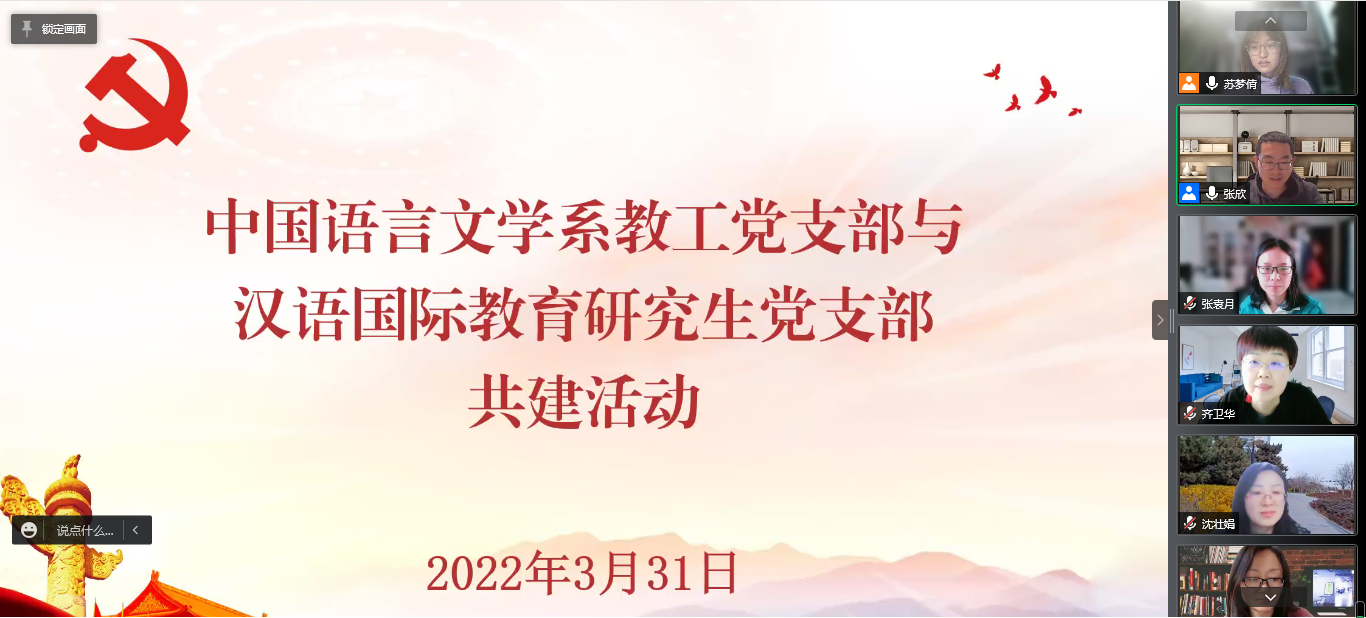 为加强思想学习,强化政治引领,增进教工党支部和学生党支部的交流,解决汉硕研究生培养过程中面临的问题,3月31日,太阳成集团tyc122ccvip中国语言文学系党支部联合汉语国际教育研究生党支部举行“坚定理想信念,争当先锋模范”专题座谈会。会议由中国语言文学系党支部书记张欣同志主持,支部全体党员出席,部分团员、党外人士列席会议。