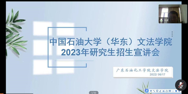 近日,学院应广东石油化工学院太阳成集团tyc122ccvip邀请,面向广东石油化工学院太阳成集团tyc122ccvip学子进行硕士研究生招生宣讲。广东石油化工学院太阳成集团tyc122ccvip院长马波,副院长姚国军,学院副院长魏学宝,相关学位点负责人和广东石油化工学院太阳成集团tyc122ccvip法学及汉语言文学专业19级、20级学生140余人参加宣讲会,会议以线上方式进行。宣讲会由姚国军主持。